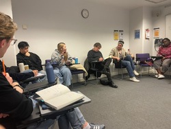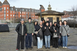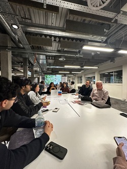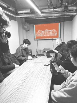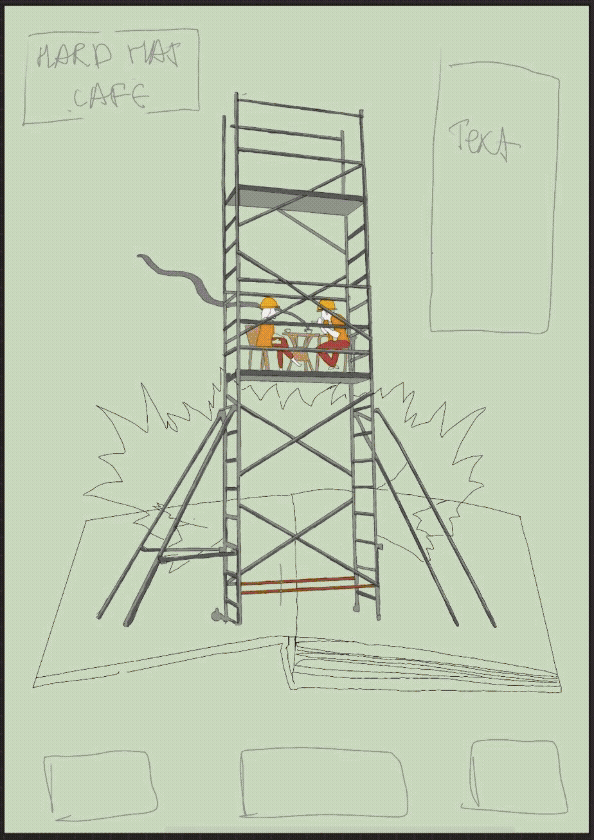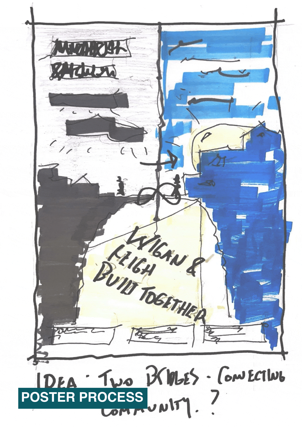 Our poster began through a series of quick hand sketches, where we explored composition, scale and how architectural forms could sit alongside people-focused